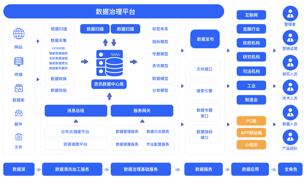數(shù)據(jù)倉庫建立了,接下來就要進行數(shù)據(jù)采集工作最聞數(shù)據(jù)治理平臺采集企業(yè)現(xiàn)有多源頭數(shù)據(jù)、第三方數(shù)據(jù)等,采用全端數(shù)據(jù)采集方式,將不同來源的數(shù)據(jù)打通——解決數(shù)據(jù)孤島問題